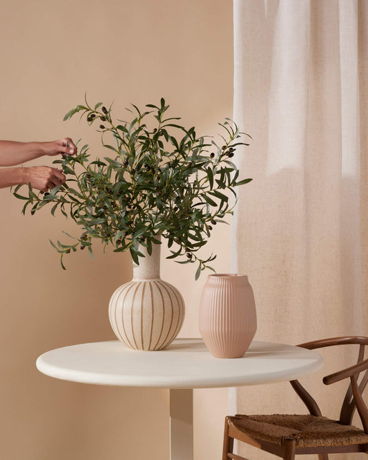 De verfijnde grijsgroene bladeren en subtiele vruchten van de kunst olijfboom en -takken zorgen voor een natuurlijke en elegante uitstraling in ieder interieur