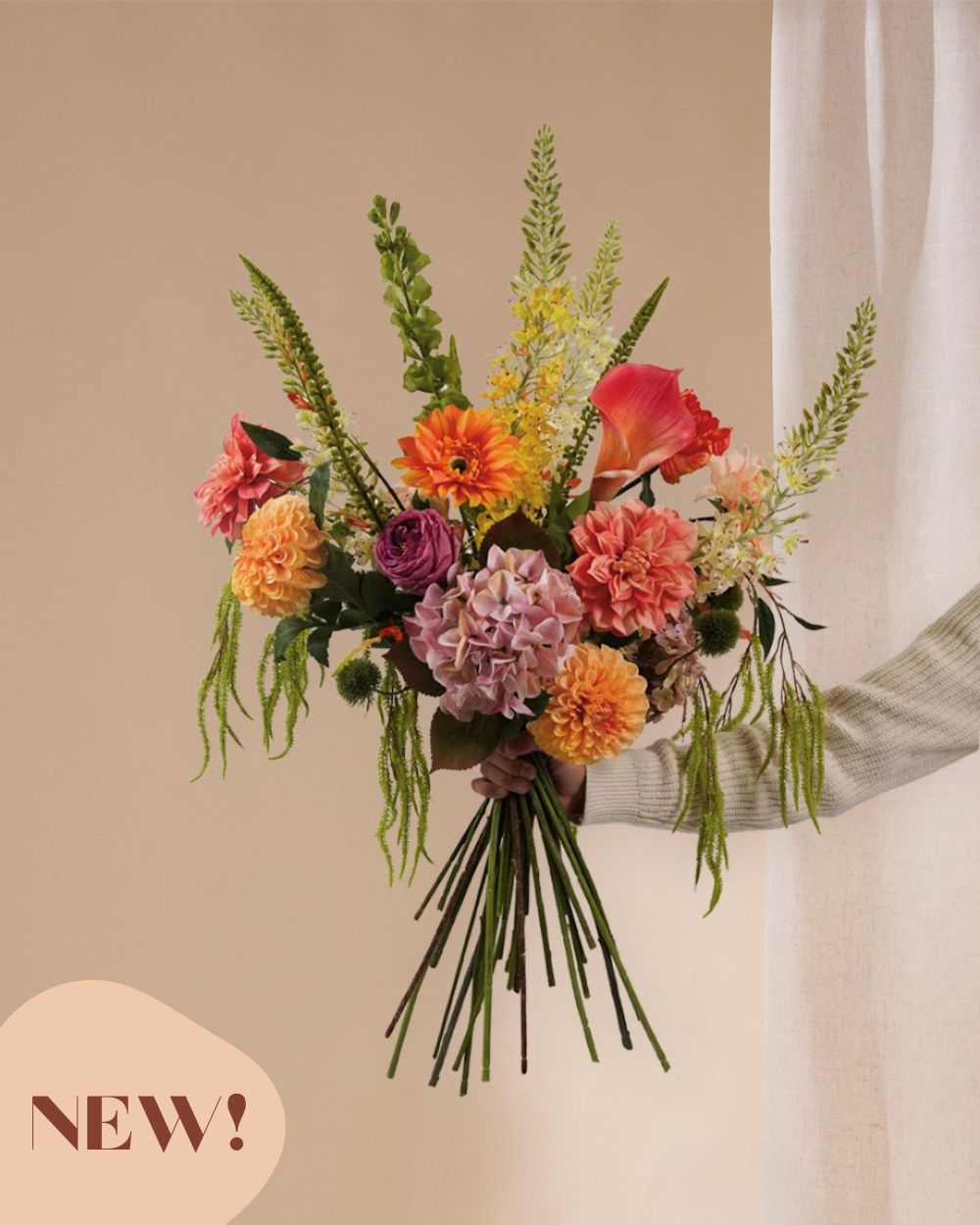 Wauw! Kunstboeket Maeve is met 25 bloemstelen het meest rijkgevulde boeket uit onze hele collectie. Prachtige dahlia's, weelderige hortensia's en een elegante calla. De eremurus en molucella geven het boeket bovendien een enorme hoogte. Of je iemand wilt verrassen met een onvergetelijk cadeau of je eigen interieur een 'boost' wil geven. Boeket Maeve maakt indruk!