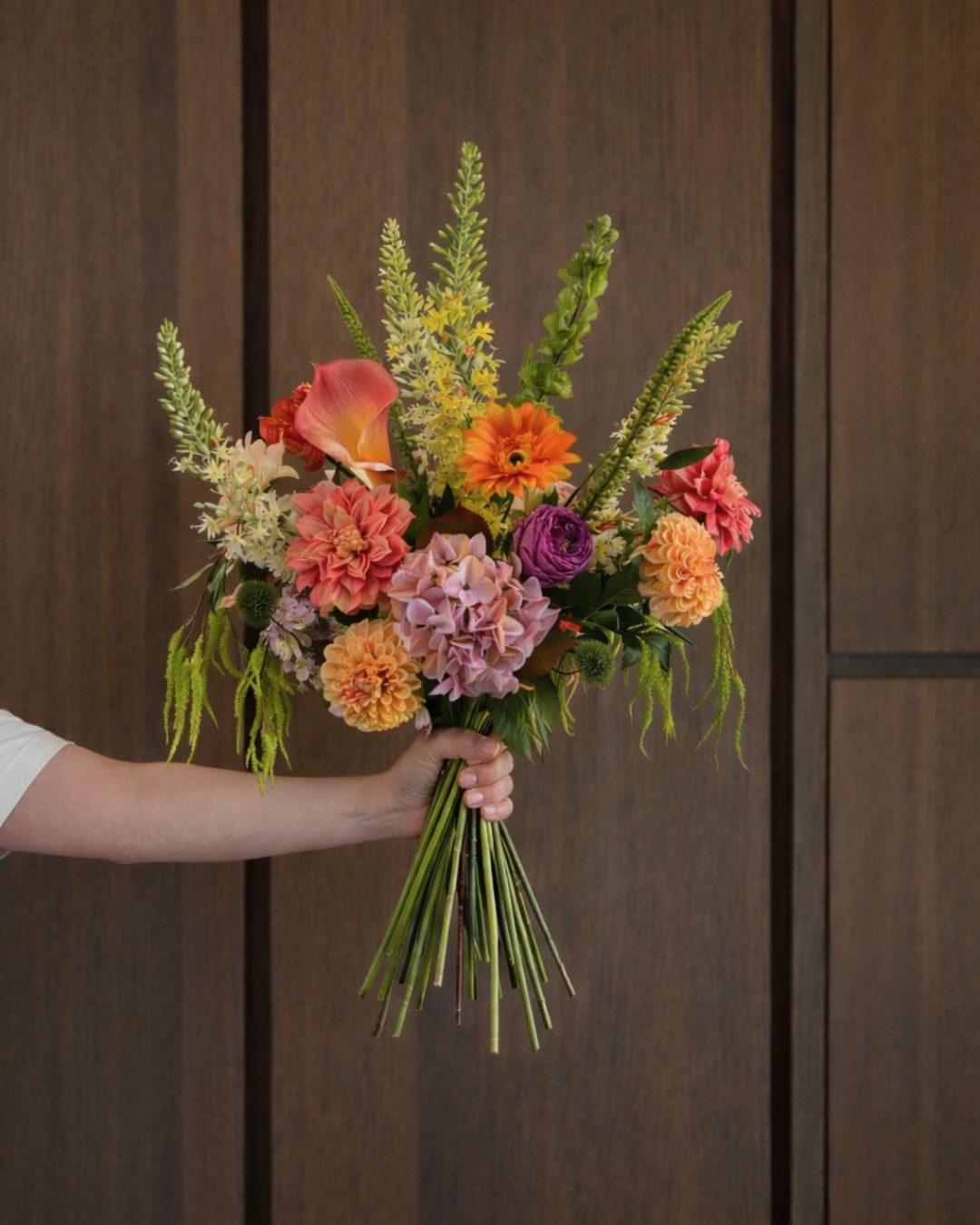 Wauw! Kunstboeket Maeve is met 25 bloemstelen het meest rijkgevulde boeket bloemen uit onze hele collectie. Prachtige dahlia's, weelderige hortensia's en een elegante calla. De eremurus en molucella geven het kunstboeket bovendien een enorme hoogte. Of je iemand wilt verrassen met een onvergetelijk cadeau of je eigen interieur een 'boost' wil geven. Boeket Maeve maakt indruk!